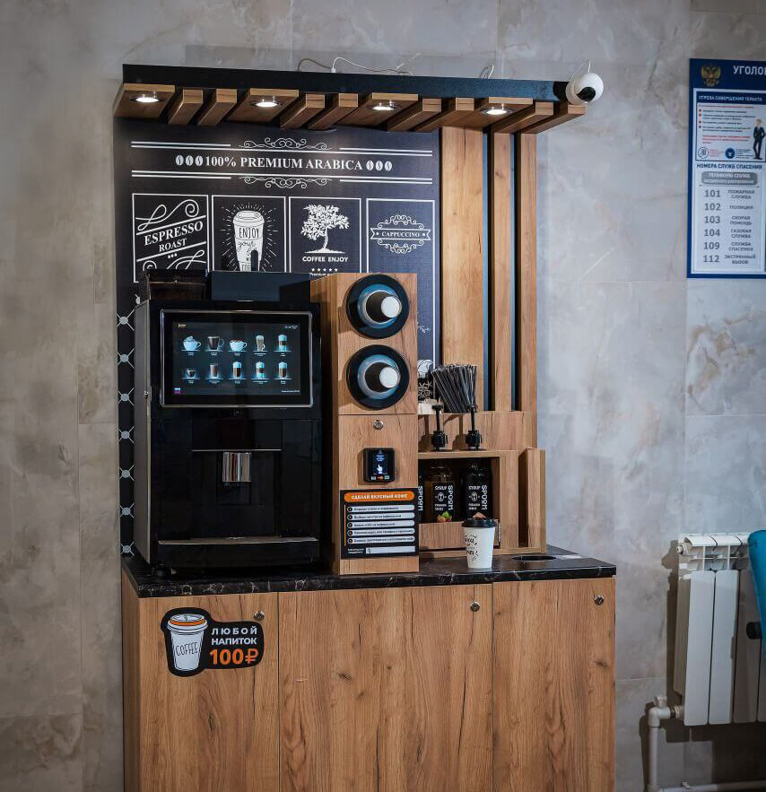 В отличие от традиционных кофеен, здесь бариста не требуется. Это снижает затраты на зарплату, обучение и организацию рабочего места для сотрудников.